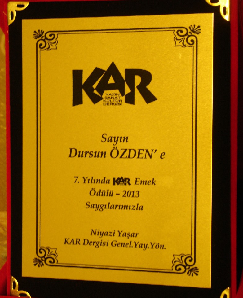 “Belgesel ve Gezi Yazarlığı” dalında Dursun Özden’e Emek Ödülü verildi. Kar Dergisi’nin 7. yayın yılında, Maltepe Türkan Saylan Kültür Merkezi’nde yapılan sanat şöleni sonunda; Şiir, Öykü, Roman, Deneme, Araştırma, Müzik, Sinema, Belgesel, Gezi Yazarlığı, Fotoğraf, Fen Bilimleri, Sosyoloji gibi pek çok dalda başarı gösterenlere ödülleri verildi. Gecenin başarılı sunumunu yapan tiyatrocu Gürsel Fırat ile Kar Dergisi genel yayın yönetmeni Niyazi Yaşar’ın şiirsel konuşmaları ve esprileri geceye damgasını vurdu. Özellikle kalabalık sanat sevenlerin katıldığı gecede, Halk Müziği konserleri ayakta alkışlandı.